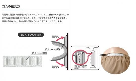 BBワッフル®は、ウエストゴムの持つ問題点であるウエスト部の圧迫窮屈感や中折れ・ねじれを軽減した「おなかに優しい」ソフトゴムです。