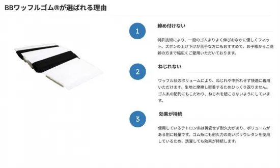 BBワッフル®は、ウエストゴムの持つ問題点であるウエスト部の圧迫窮屈感や中折れ・ねじれを軽減した「おなかに優しい」ソフトゴムです。